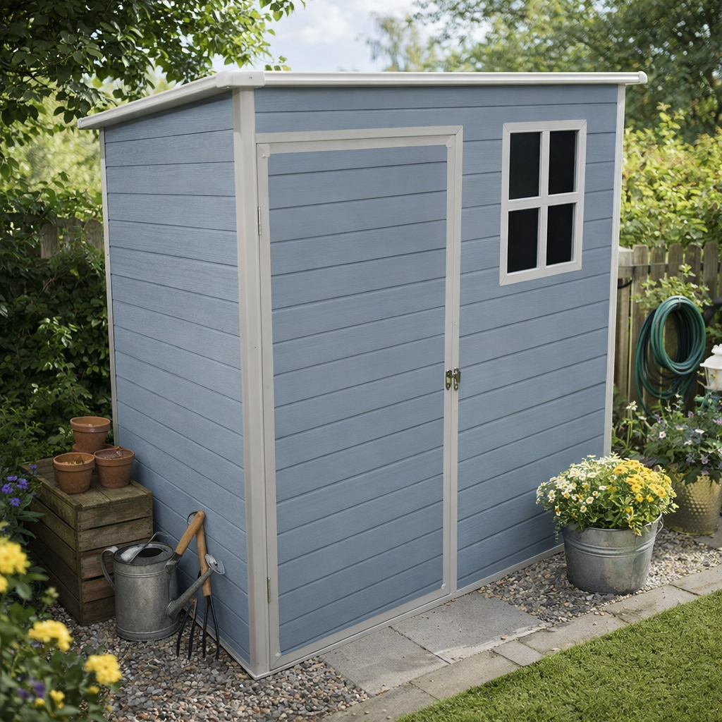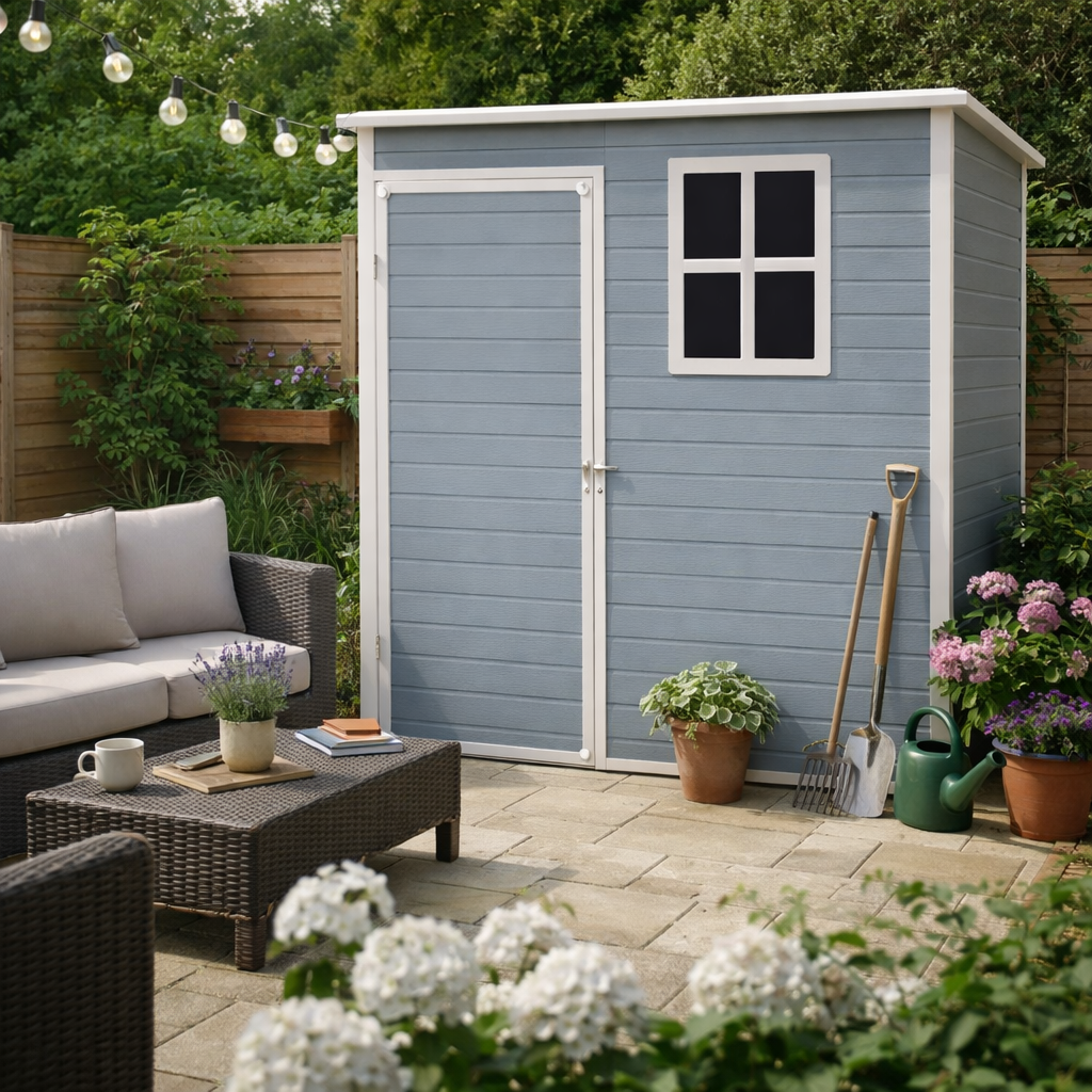 - domek narzędziowy o powierzchni 1,5 m² idealnie sprawdza się do przechowywania narzędzi ogrodowych i sprzętu