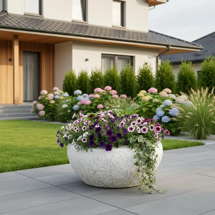 Donica wyróżnia się nieregularną, strukturalną fakturą, która nadaje jej unikalny wygląd i podkreśla naturalny charakter aranżacji. Jasna kolorystyka doskonale komponuje się z zielenią roślin oraz materiałami takimi jak drewno, kamień czy beton.