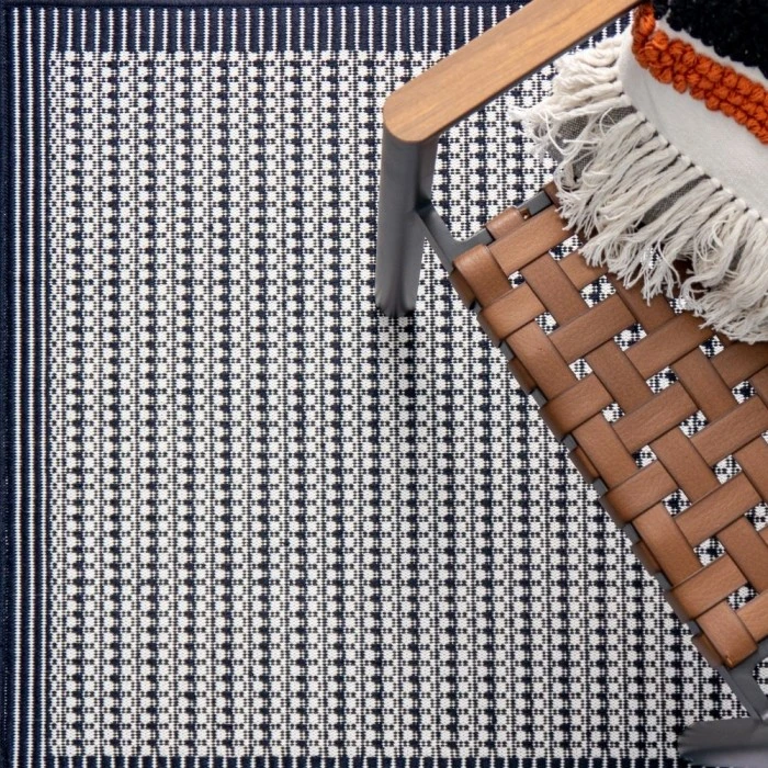 Dywan zewnętrzny Lui wyróżnia się drobnym, regularnym wzorem o tekstylnym charakterze, który nadaje przestrzeni spokojny i uporządkowany wygląd. Subtelna struktura sprawia, że dywan nie dominuje aranżacji, lecz stanowi eleganckie tło dla mebli ogrodowych i dodatków. Czarno-biała kolorystyka doskonale wpisuje się w nowoczesne, skandynawskie oraz minimalistyczne przestrzenie.