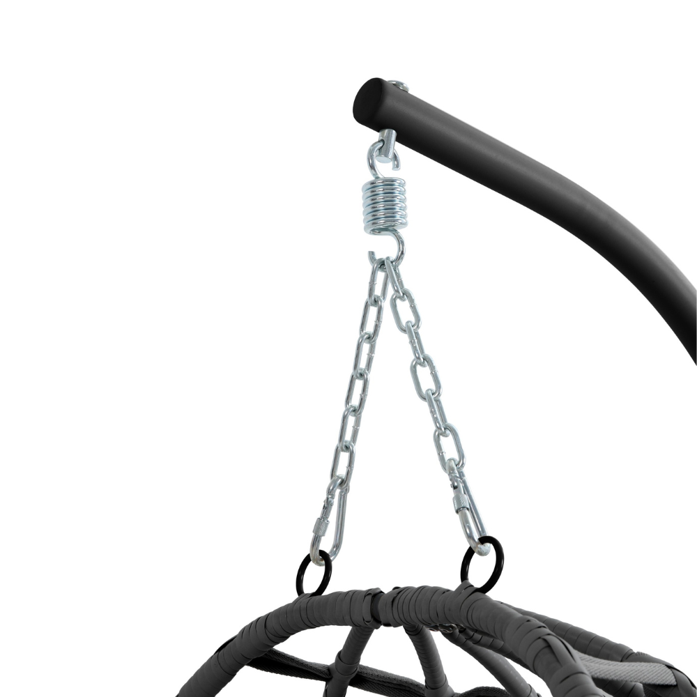 Ramy fotela wykonane są z rur stalowych ocynkowanych i malowanych proszkowo, co zapewnia im wysoką odporność na korozję i warunki atmosferyczne. Grube profile (Ø42 mm oraz Ø38 mm) nadają konstrukcji sztywność i stabilność, dzięki czemu fotel bezpiecznie utrzymuje użytkownika podczas bujania. Podstawa o szerokości 100 cm gwarantuje pewne podparcie, a sama konstrukcja zachowuje trwałość nawet przy intensywnym użytkowaniu.