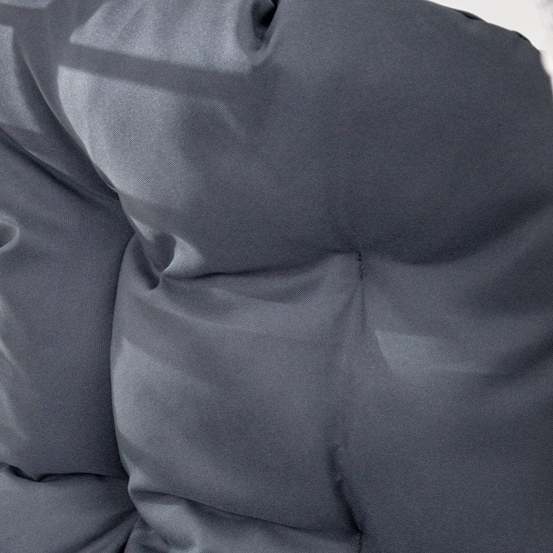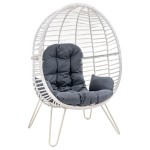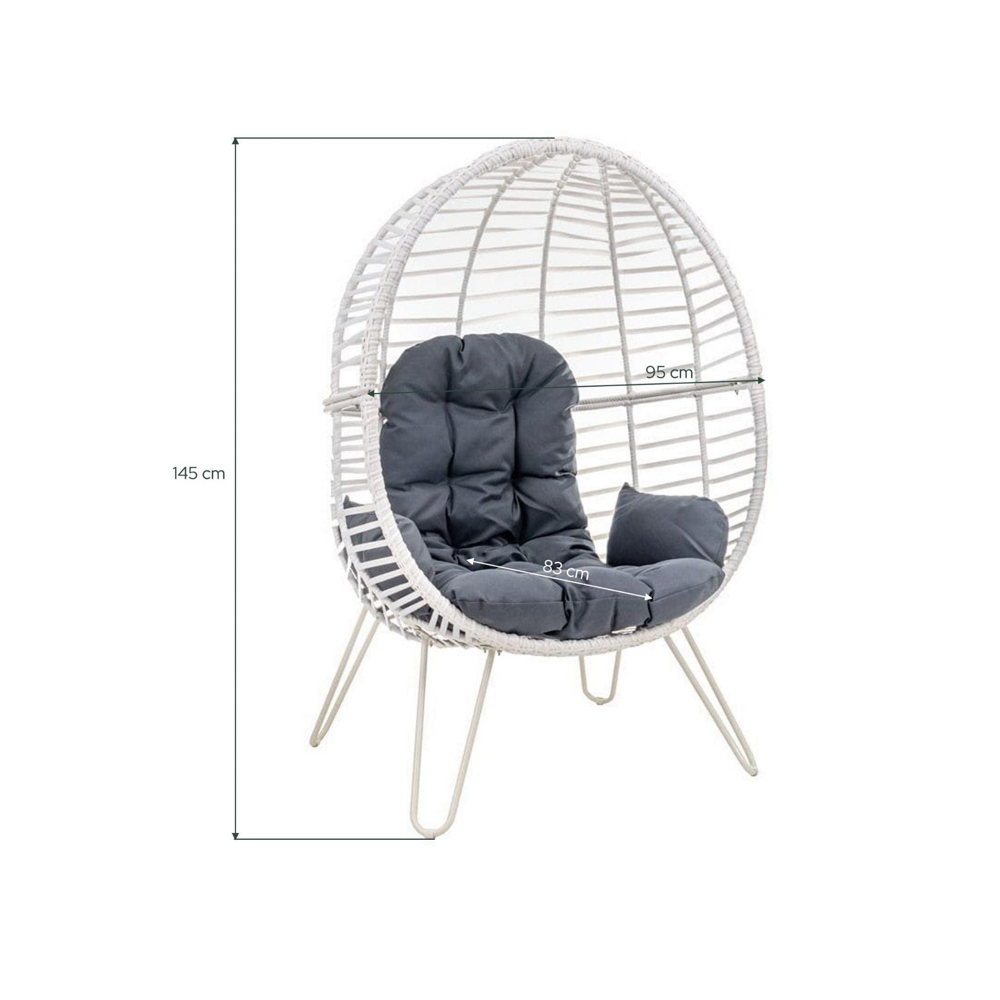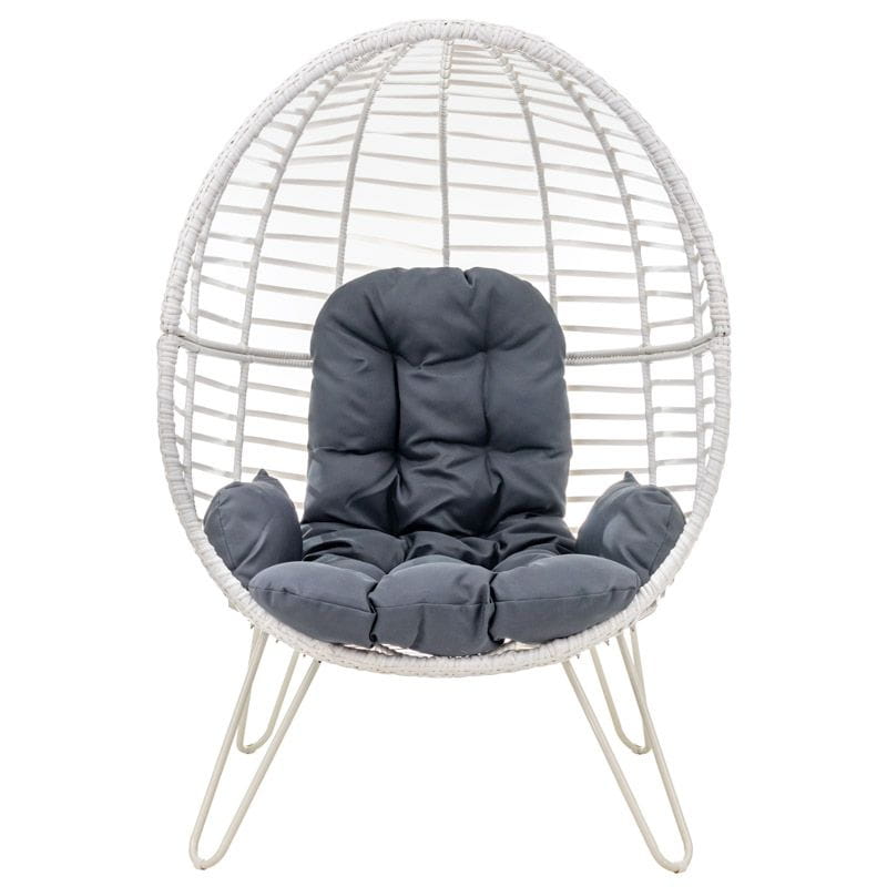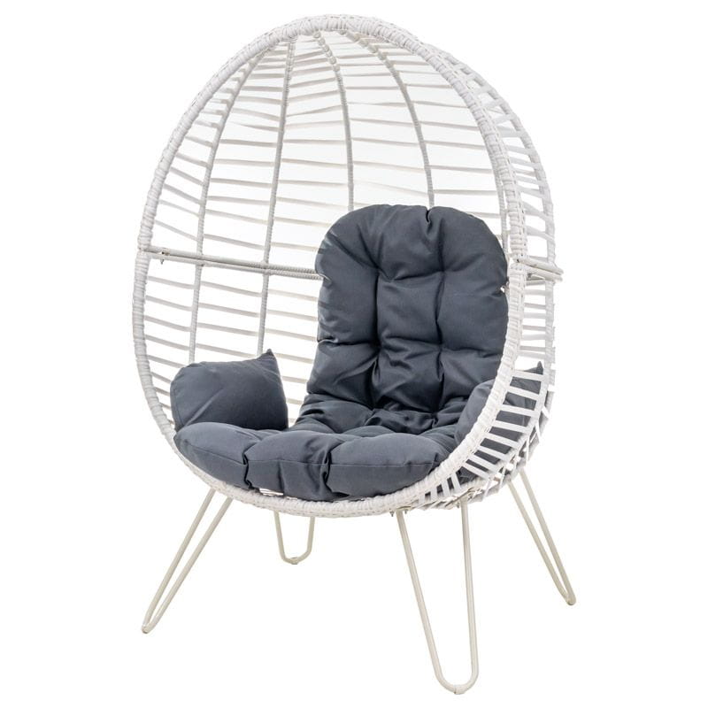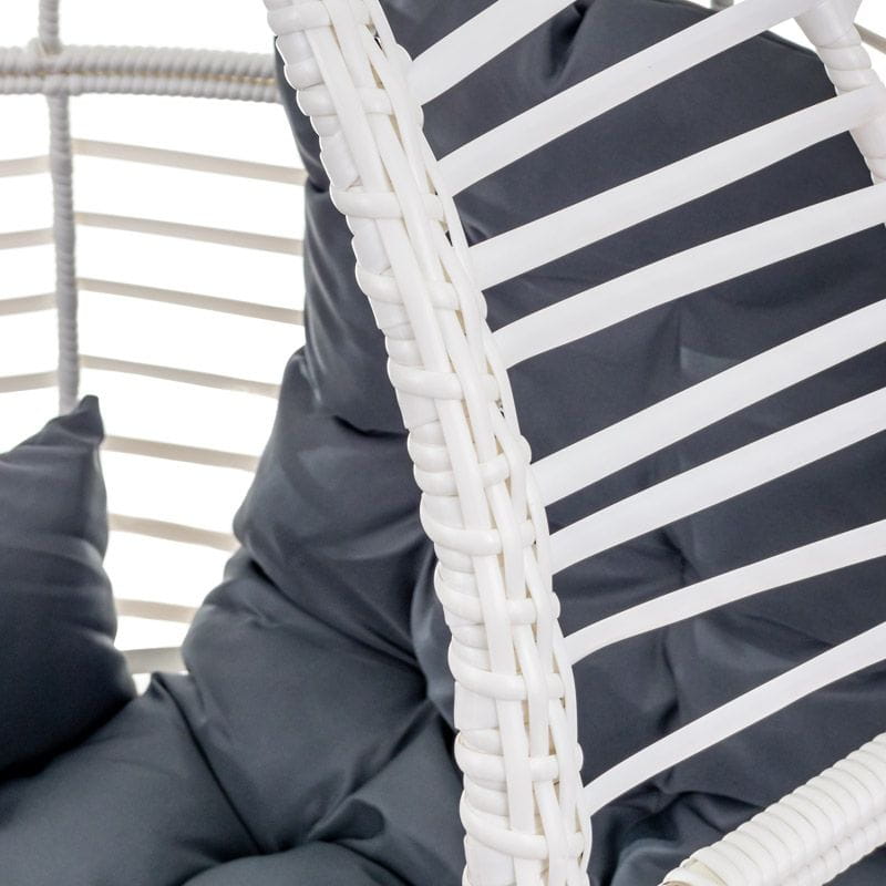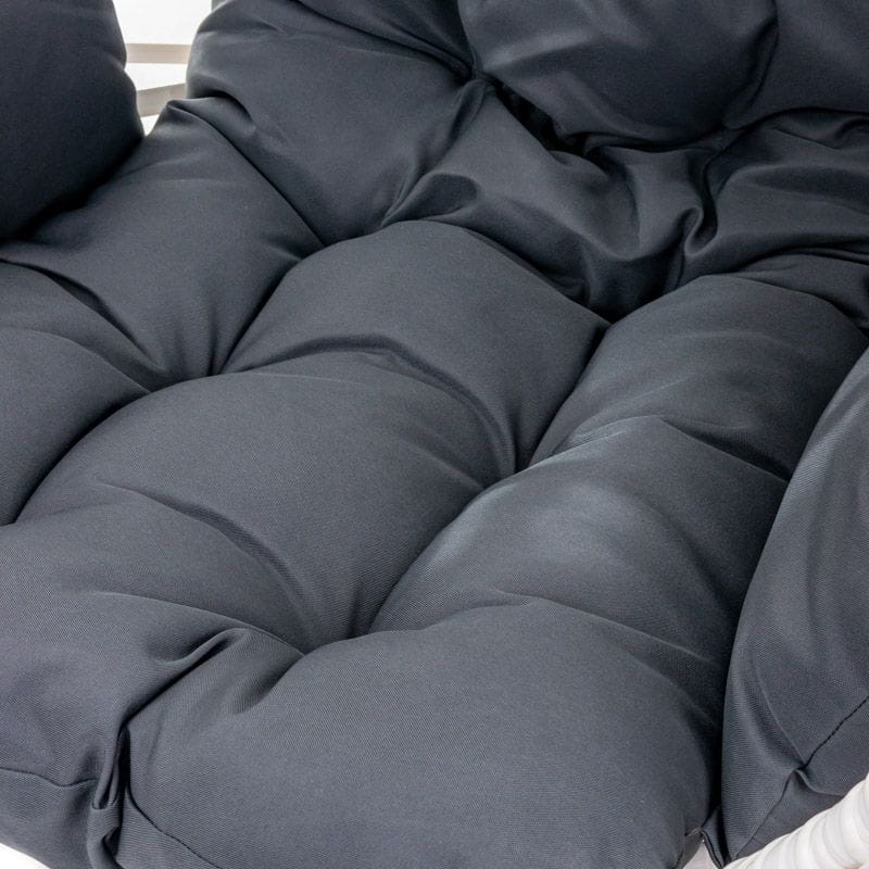 Kosz fotela jajo jest szeroki i wysoki, dzięki czemu przyjęcie wygodnej pozycji podczas relaksu jest bezproblemowe. Dodatkowo w zestawie zawarte są miękkie poduszki na siedzisko. Poduszki wygodnego fotela do salonu posiadają sznureczki pozwalające na przymocowanie ich do kosza fotela.