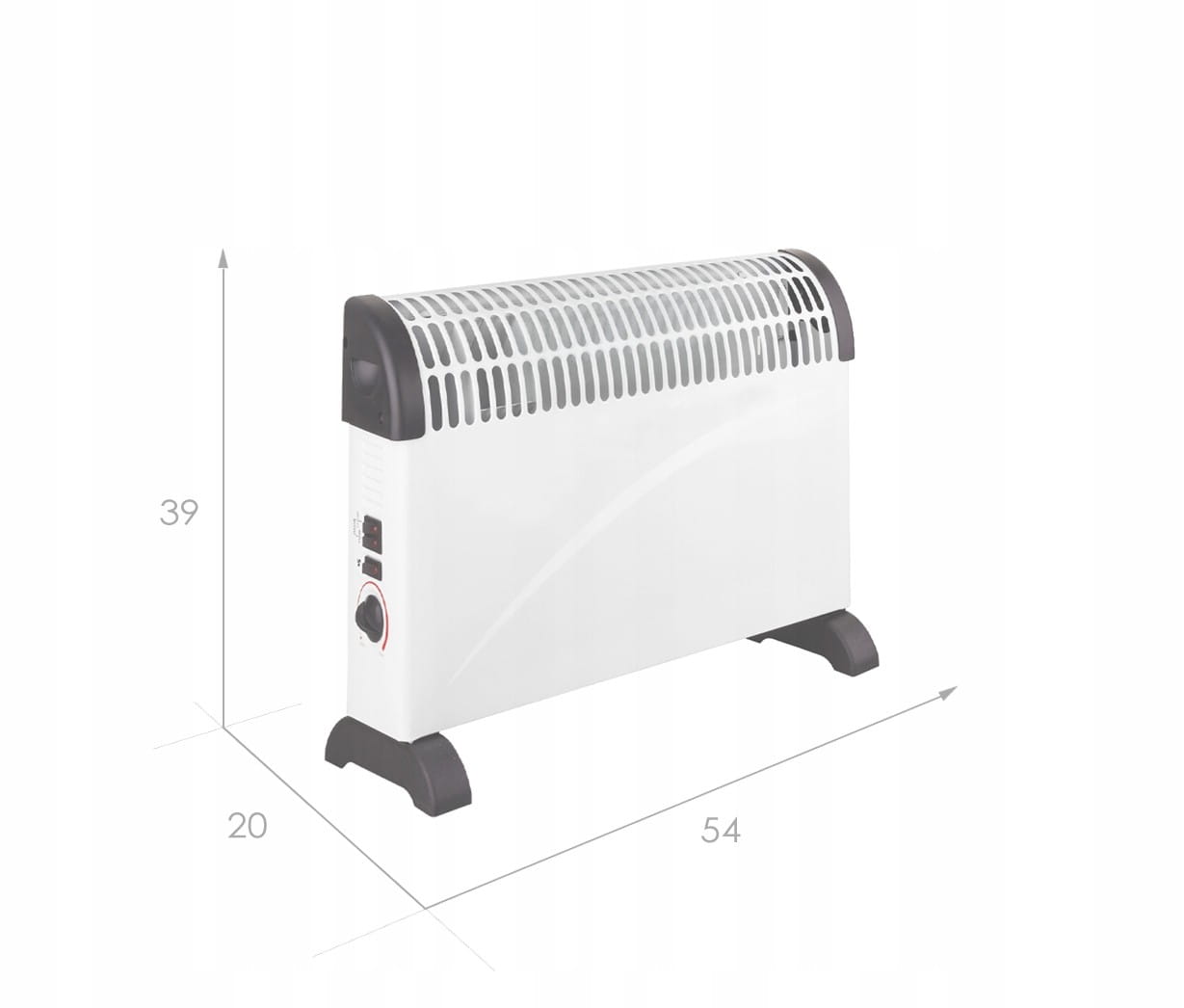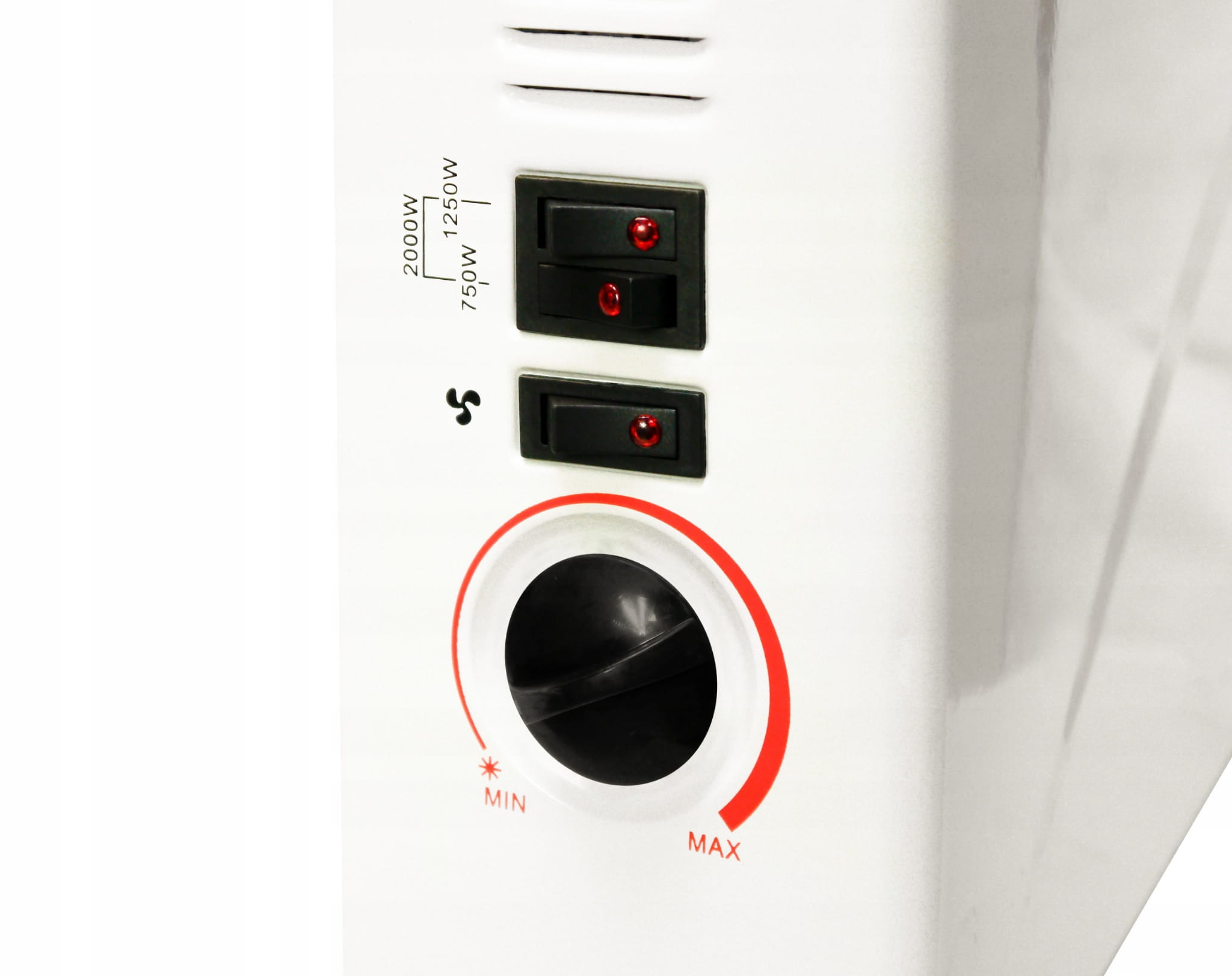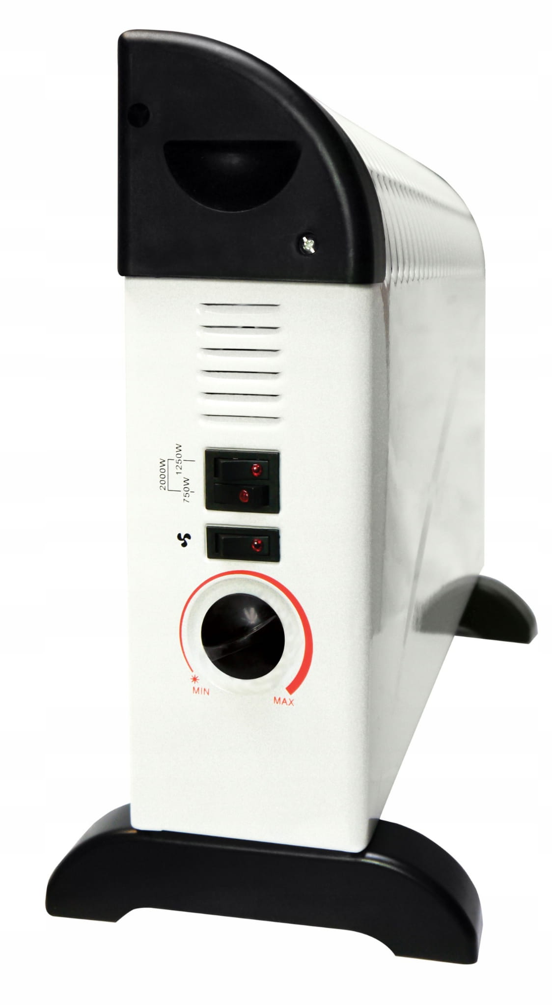 Wydajny grzejnik elektryczny posiada manualnie regulowany termostat, dzięki któremu moc grzania może być regulowana 3-poziomowo (750W/1250W/2000W).