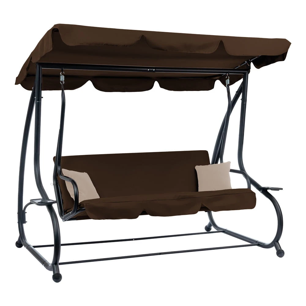 Brązowa huśtawka ławka ma funkcję rozkładania do pozycji leżącej, co umożliwia relaks w dowolnej pozycji. Poduszki na siedzisko oraz oparcie znacznie wpływają na poziom komfortu. Dodatkowym atutem są funkcjonalne półki boczne przeznaczone do przechowywania podręcznych przedmiotów, np. chłodnego napoju lub ulubionej książki. Regulowany daszek łatwo dopasować do indywidualnych potrzeb, aby chronić się przed promieniami słonecznymi.