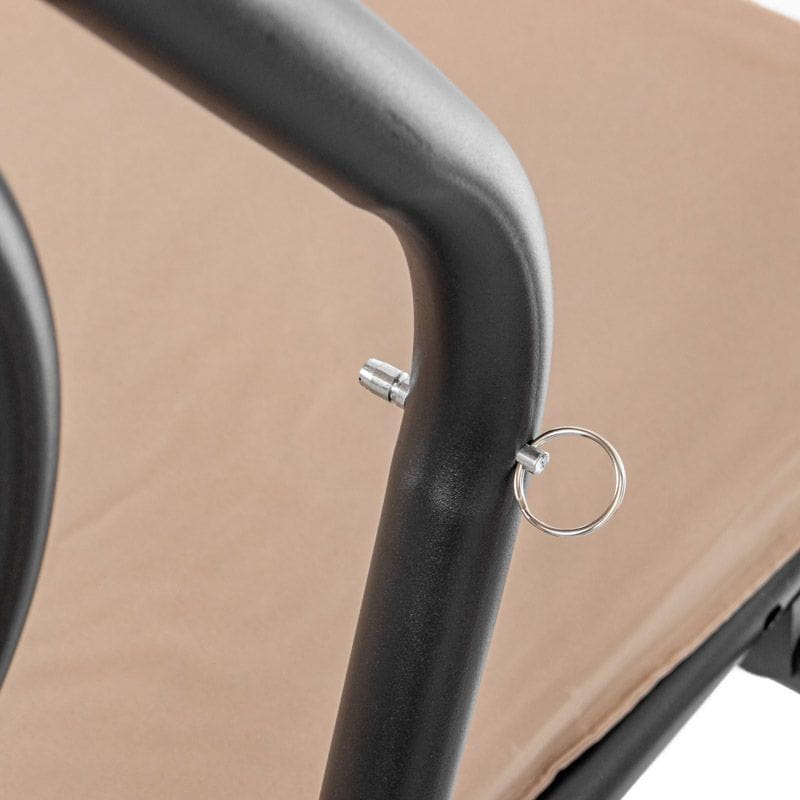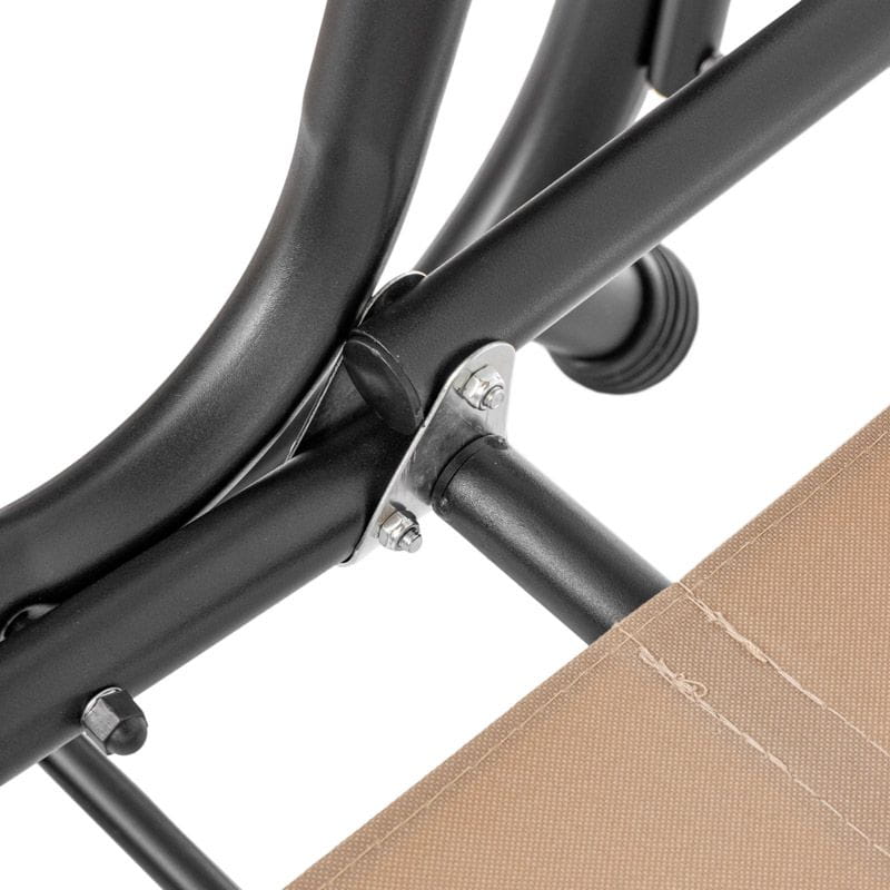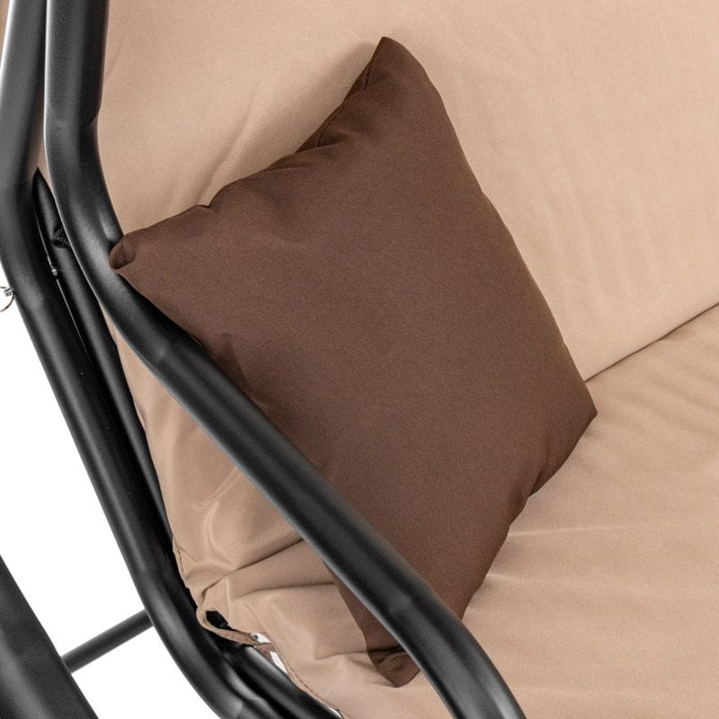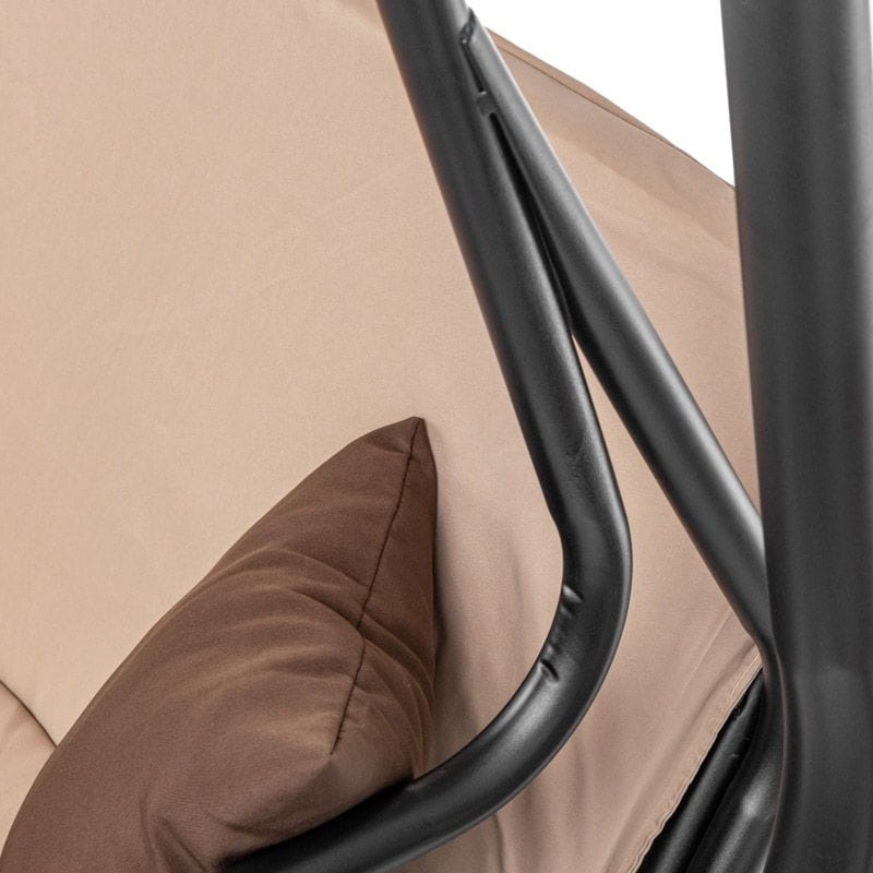 Beżowa huśtawka ławka ma funkcję rozkładania do pozycji leżącej, co umożliwia relaks w dowolnej pozycji. Pogrubione poduszki 5cm na siedzisko oraz oparcie znacznie wpływają na poziom komfortu.
