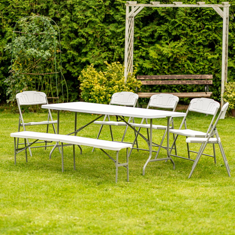 Składane ławki cateringowe doskonale sprawdzają się zarówno dla osób prywatnych, jak i firm cateringowych.
