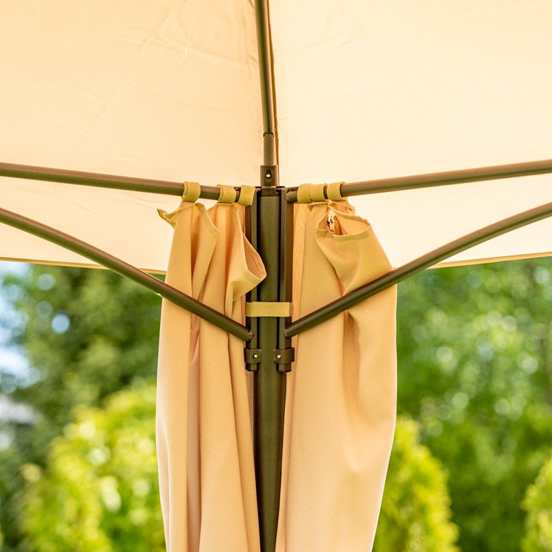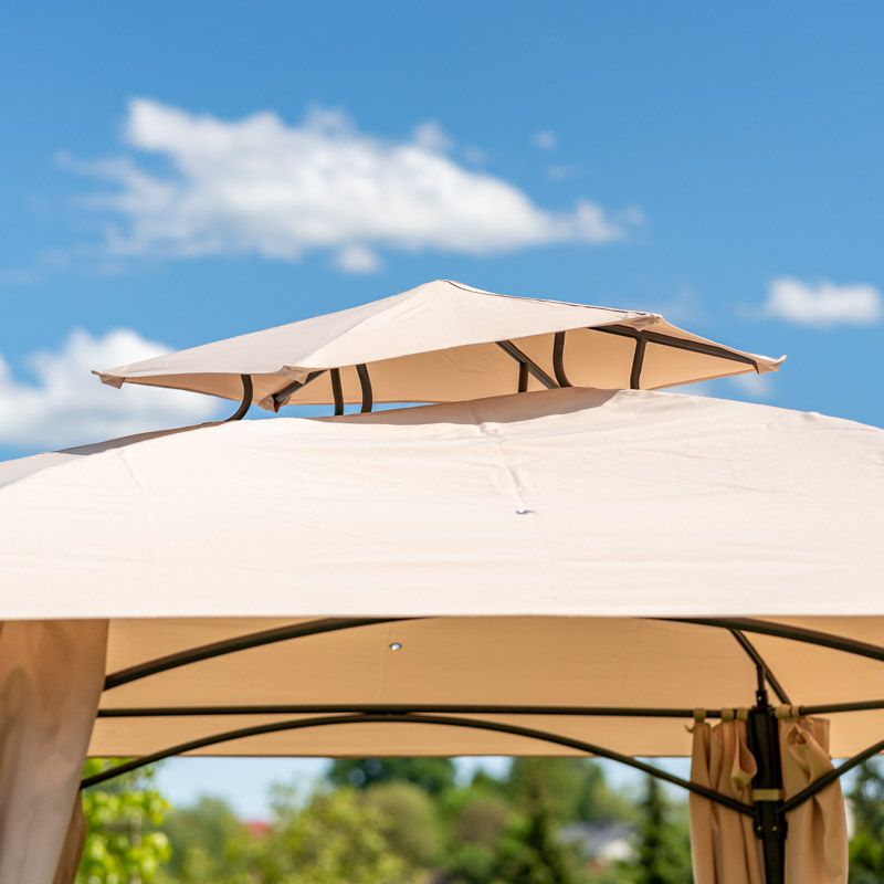 Namiot ogrodowy wyposażony jest w zsuwane ściany boczne co pozwala na otworzenie lub zamknięcie w zależności od indywidualnych potrzeb. Atutem jest dwustopniowy dach pawilonu ogrodowego, który zapewnia cyrkulację powietrza we wnętrzu namiotu ogrodowego.