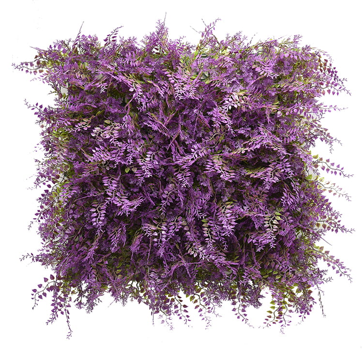 Panel kolorowych roślin Fioletowa Paproć 50 x 50 cm. Łącząc ze sobą kilka paneli stworzyć można elegancką roślinną ścianę, która nada każdej aranżacji niepowtarzalnego charakteru. To propozycja zarówno do stylizacji zewnętrznych tarasów i balkonów, ale też do wnętrz, na przykład w hotelach i biurach. Montaż paneli jest łatwy i nie zajmuje dużo czasu. Sztuczne kwiaty wykonane są w 100% z czystego materiału PE, który świetnie sprawdza się w aranżacjach zewnętrznych.