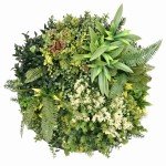 Panel kolorowych roślin Harmonia I o średnicy 50 cm. Łącząc ze sobą kilka paneli stworzyć można elegancką roślinną ścianę, która nada każdej aranżacji niepowtarzalnego charakteru. To propozycja zarówno do stylizacji zewnętrznych tarasów i balkonów, ale też do wnętrz, na przykład w hotelach i biurach. Montaż paneli jest łatwy i nie zajmuje dużo czasu. Sztuczne kwiaty wykonane są w 100% z czystego materiału PE, który świetnie sprawdza się w aranżacjach zewnętrznych.