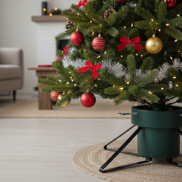 Nowoczesny stojak choinkowy łączy funkcjonalność z estetyką. Solidne, metalowe nogi i wytrzymała podstawa zapewniają stabilność drzewka, a eleganckie, zielono-czarne wykończenie sprawia, że stojak staje się również elementem dekoracyjnym. Zintegrowany zbiornik na wodę o pojemności 1,8 litra zapobiega szybkiemu wysychaniu igieł i pomaga utrzymać świeży wygląd drzewka przez dłuższy czas. Odpowiedni do choinek naturalnych i sztucznych do wysokości 2 metrów.