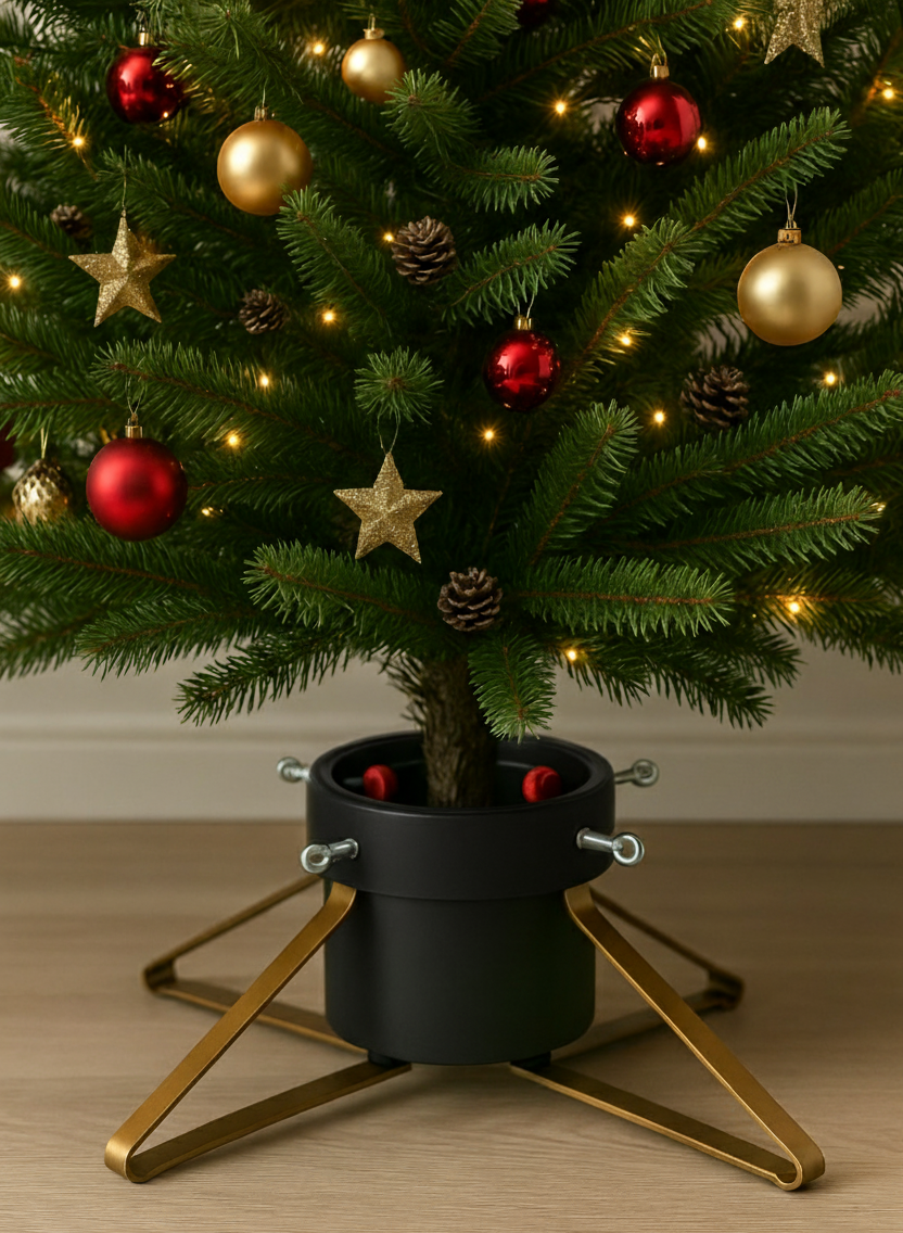 Nowoczesny stojak choinkowy łączy funkcjonalność z estetyką. Solidne, metalowe nogi i wytrzymała podstawa zapewniają stabilność drzewka, a eleganckie, czarno-złote wykończenie sprawia, że stojak staje się również elementem dekoracyjnym. Zintegrowany zbiornik na wodę o pojemności 1,8 litra zapobiega szybkiemu wysychaniu igieł i pomaga utrzymać świeży wygląd drzewka przez dłuższy czas. Odpowiedni do choinek naturalnych i sztucznych do wysokości 2 metrów.