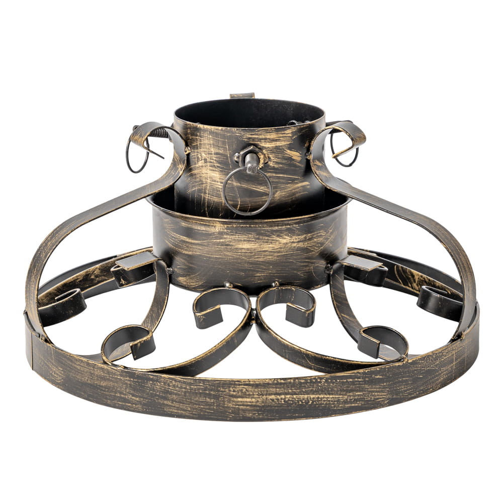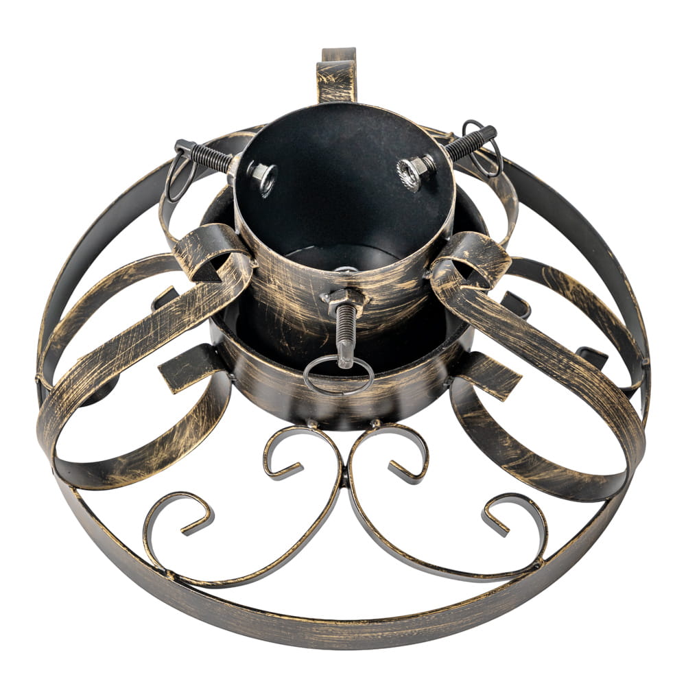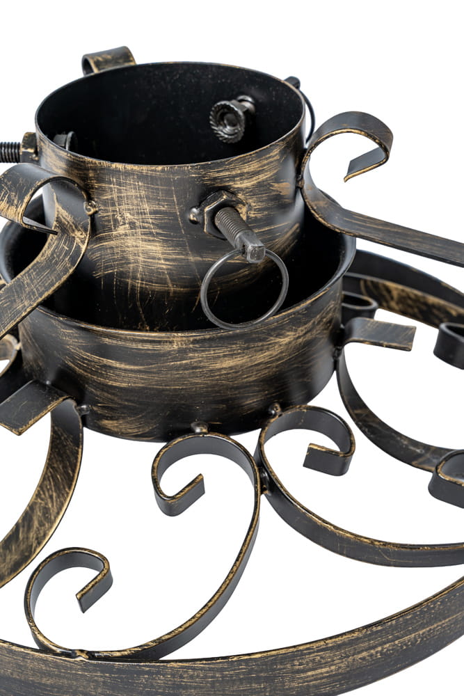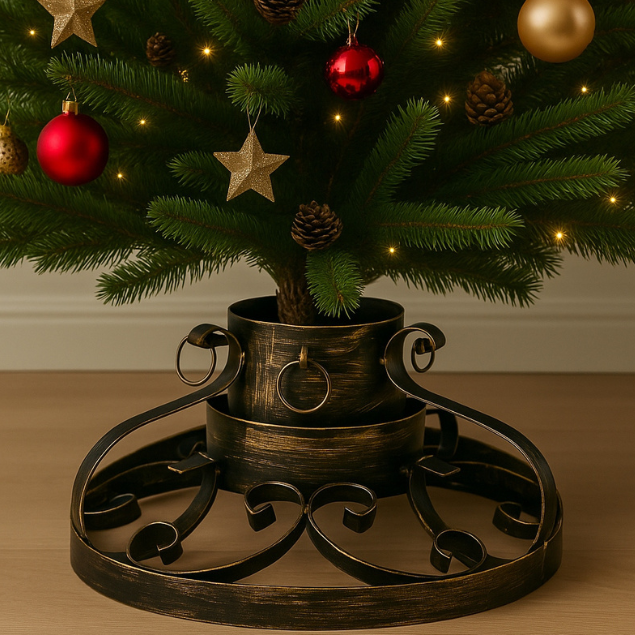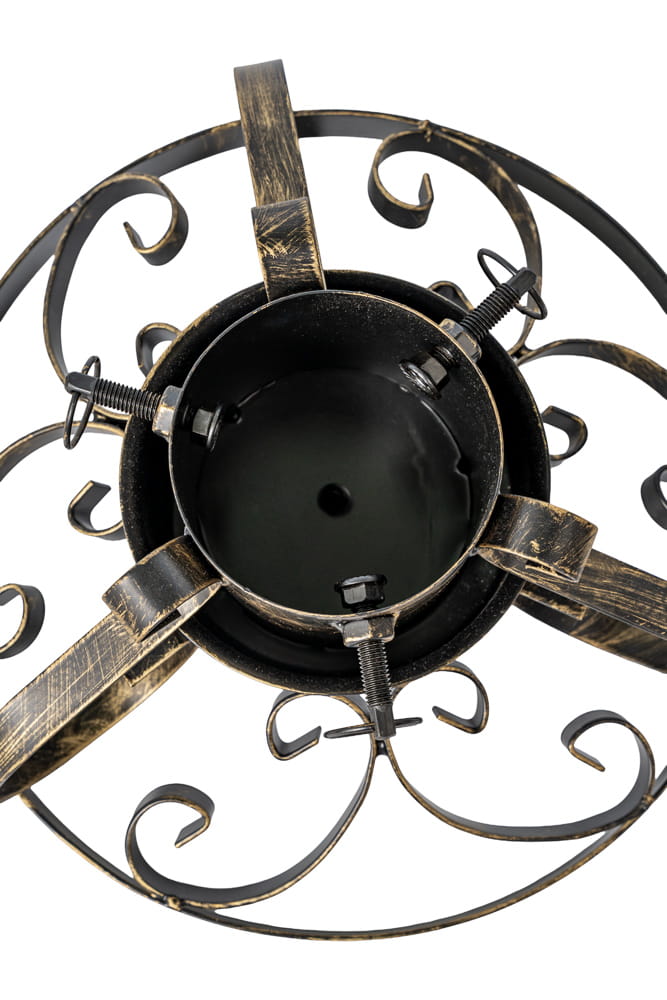 Stojak w odcieniu antycznego złota stanowi stylowe i dekoracyjne uzupełnienie świątecznej aranżacji. Jego elegancki kolor sprawia, że doskonale harmonizuje z blaskiem lampek, ciepłem świątecznych tekstyliów oraz klasycznymi ozdobami w czerwieni, zieleni czy bieli. To ponadczasowa barwa, która nadaje wnętrzu charakteru i subtelnej, świątecznej elegancji. Dzięki dekoracyjnemu wykończeniu stojak sam w sobie staje się elementem wystroju — nie trzeba go ukrywać pod ozdobami czy tkaniną. Połączenie złotego koloru z metalową konstrukcją tworzy efekt spójny, schludny i nowoczesny. Choinka oparta na takiej podstawie prezentuje się wyjątkowo estetycznie, a cała aranżacja zyskuje bardziej dopracowany, pełny charakter.