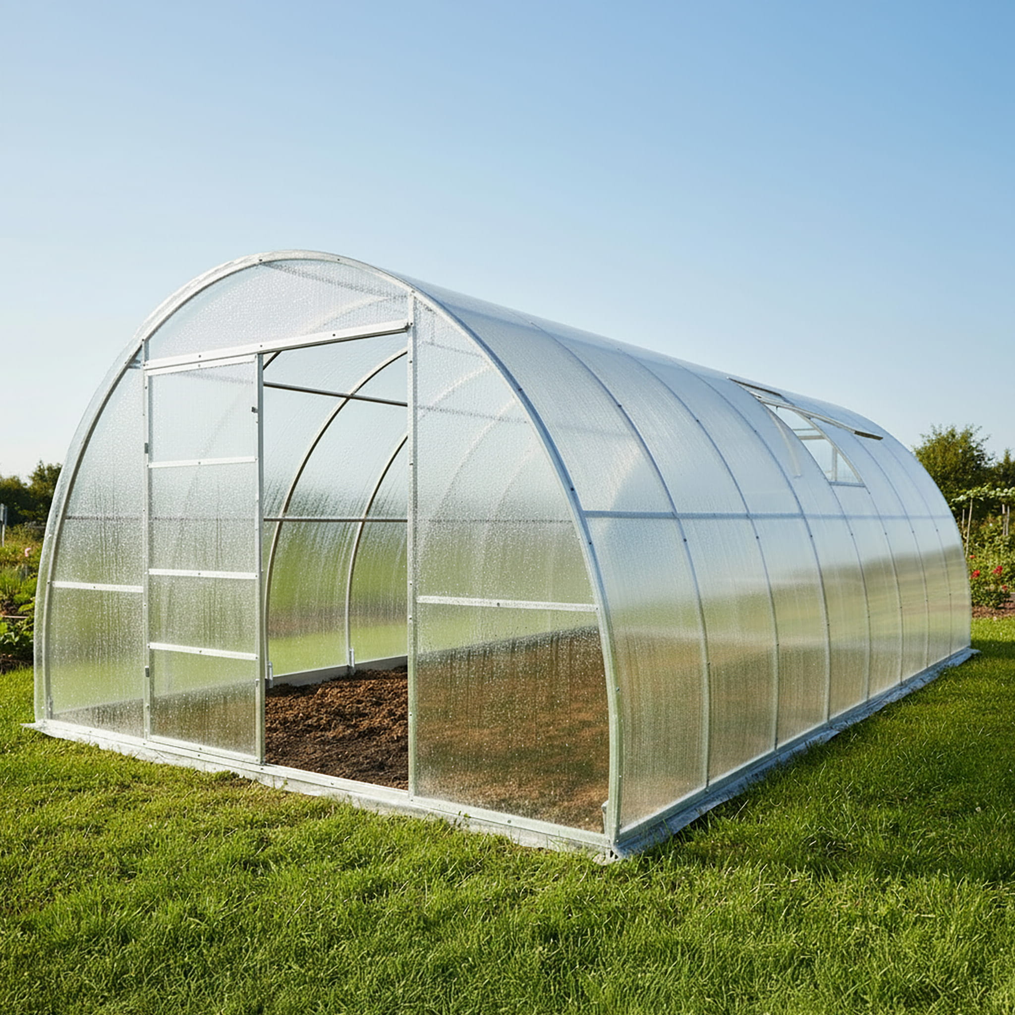 Konstrukcja szklarni jest wyjątkowo solidna i trwała. Nośne elementy konstrukcji są wykonane z ocynkowanych profili stalowych o przekroju 40x20 mm, co gwarantuje ochronę przed rdzą. Dzięki temu, szklarnia będzie służyć przez wiele lat, niezależnie od warunków zewnętrznych.