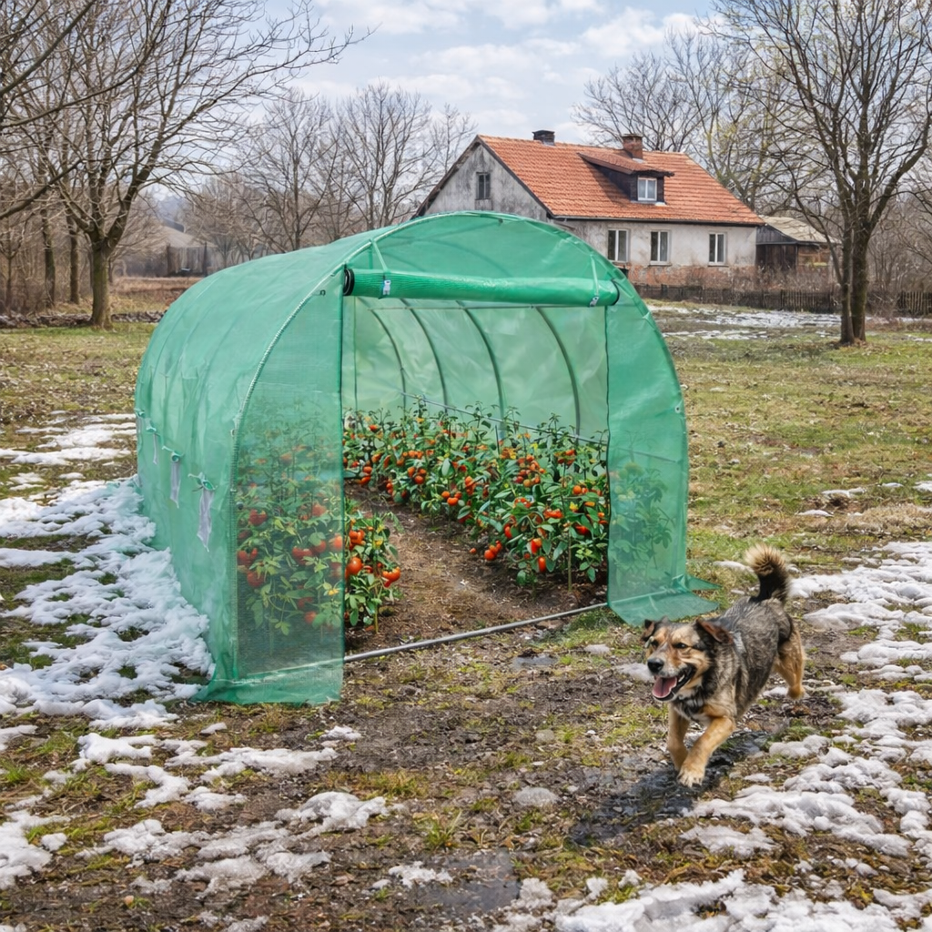 Nowoczesna szklarnia foliowa ma zwijane drzwi z suwakiem, co znacznie podnosi komfort użytkowania. Atutem jest 12 okien z siatką, które zapewniają cyrkulację powietrza przy jednoczesnej ochronie przed niechcianymi insektami.