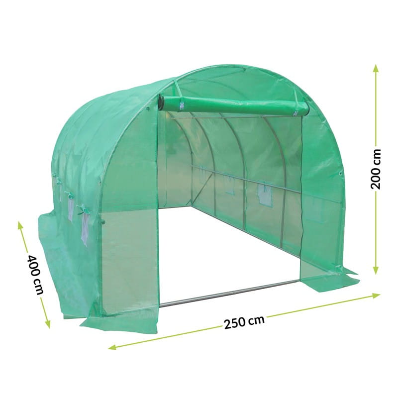 Nowoczesna szklarnia foliowa ma zwijane drzwi z suwakiem, co znacznie podnosi komfort użytkowania. Atutem jest 8 okien z siatką, które zapewniają cyrkulację powietrza przy jednoczesnej ochronie przed niechcianymi insektami.