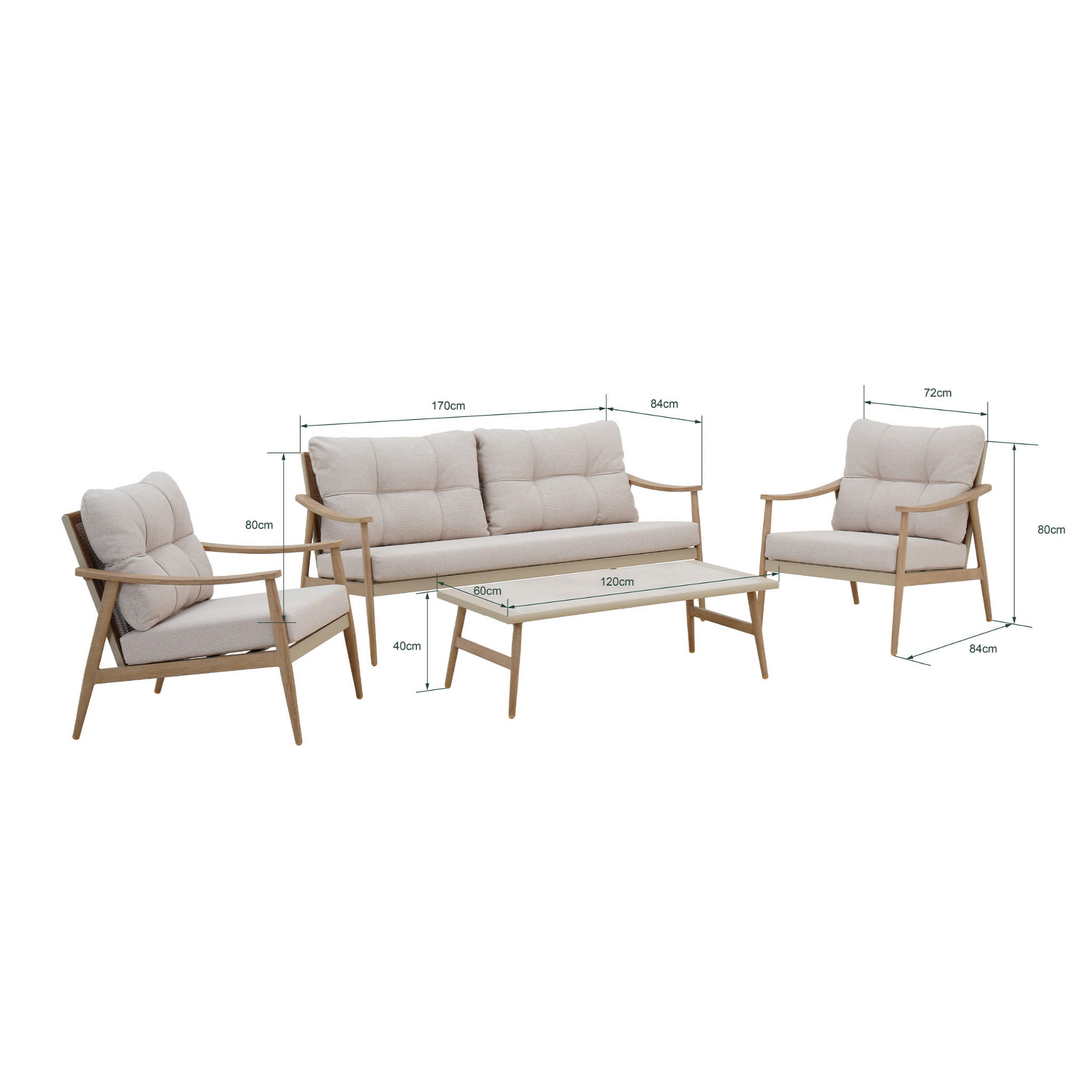Poduszki wykonane z tkaniny Olefin, słynącej z odporności na promieniowanie UV i wilgoć, zapewniają nie tylko komfort, ale również długotrwałą świeżość i jakość. Grube, miękkie wypełnienie siedzisk i oparć gwarantuje wyjątkowy komfort wypoczynku, a beżowy kolor nadaje meblom subtelny, elegancki charakter.