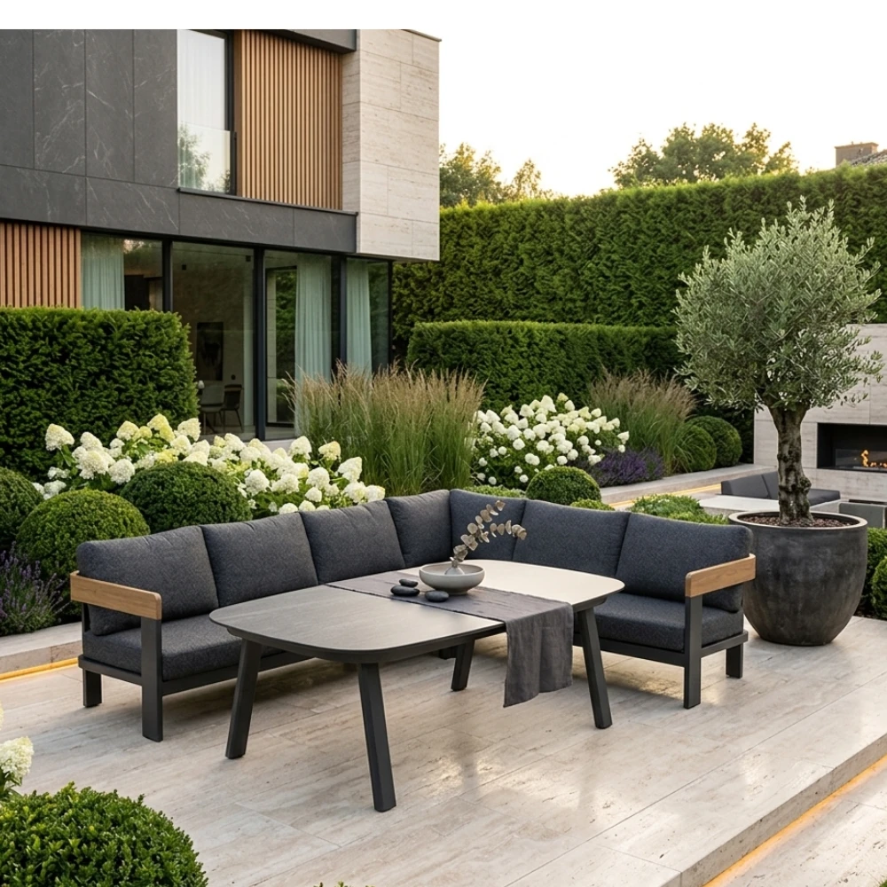 Minimalistyczna forma i spójne wykończenie sprawiają, że meble harmonijnie komponują się z różnymi stylami przestrzeni zewnętrznych. To propozycja dla osób, które szukają estetycznego i praktycznego rozwiązania do swojej strefy relaksu i spotkań.