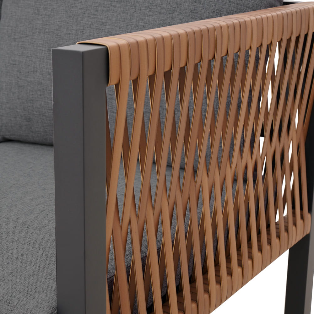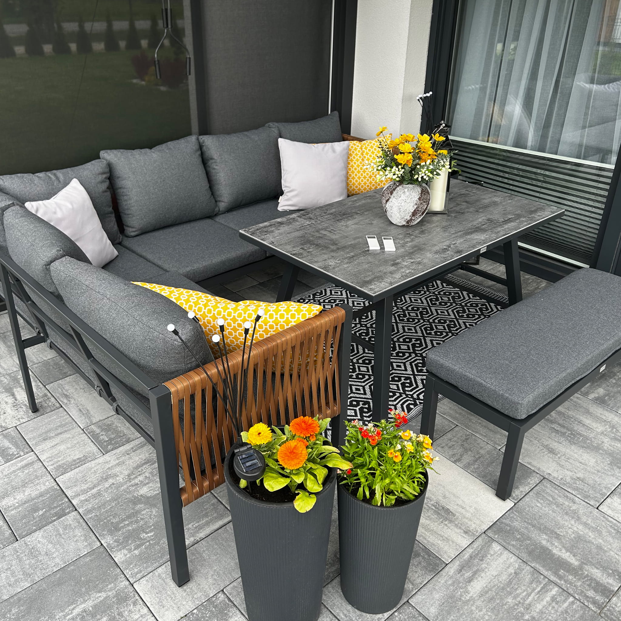 Solidne meble do ogrodu z aluminiową ramą malowaną proszkowo, sprawdzą się w użytkowaniu zewnętrznym doskonale, ze względu na swoją zwiększoną odporność na korozję. W połączeniu z konstrukcją plecioną z płaskiego rattanu syntetycznego, tworzą meble, które posłużą przez kilka sezonów. Zastosowane materiały cechują się zwiększoną odpornością na niekorzystne warunki atmosferyczne i są łatwe w utrzymaniu w czystości.