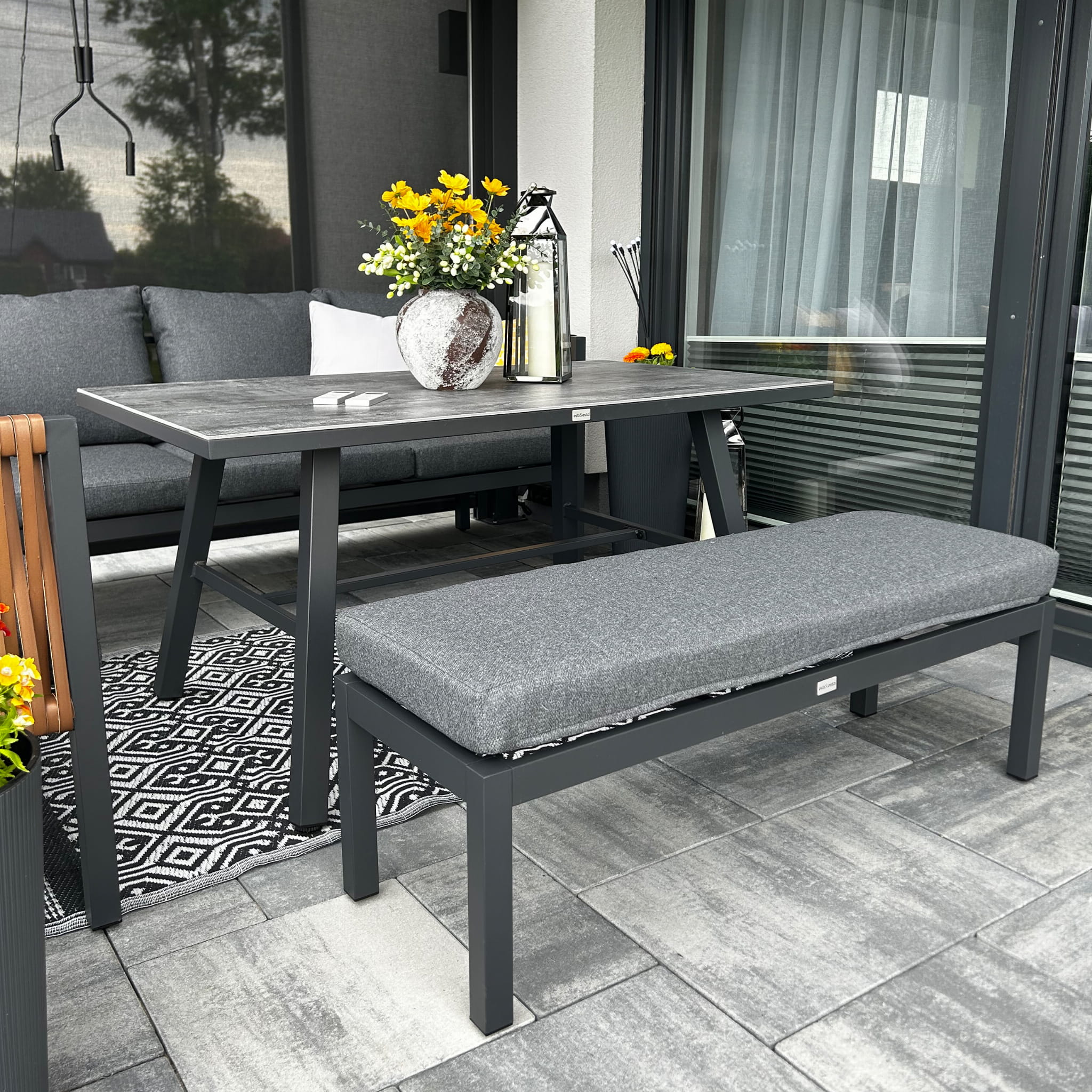 - komfortowy zestaw mebli ogrodowych z dużym narożnikiem, ławką i stołem, to propozycja do wyposażenia miejsca relaksu, w którym wypoczywać będzie kilka osób