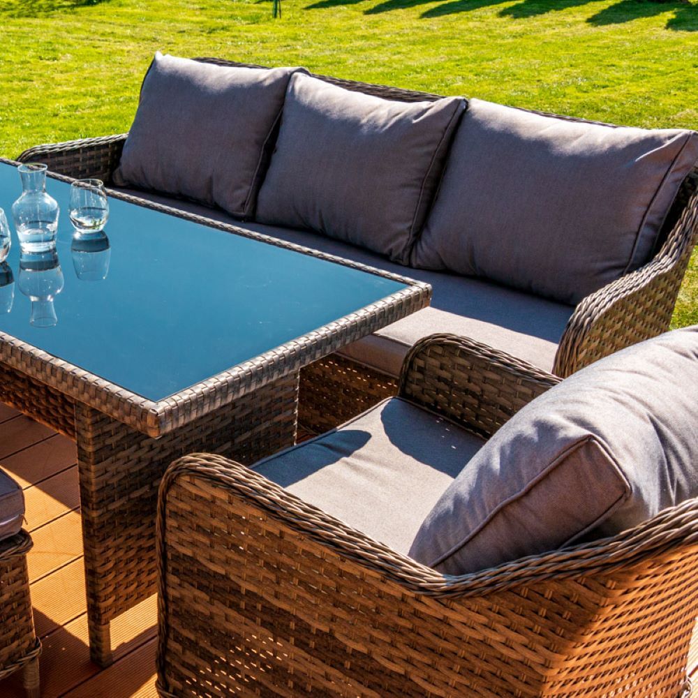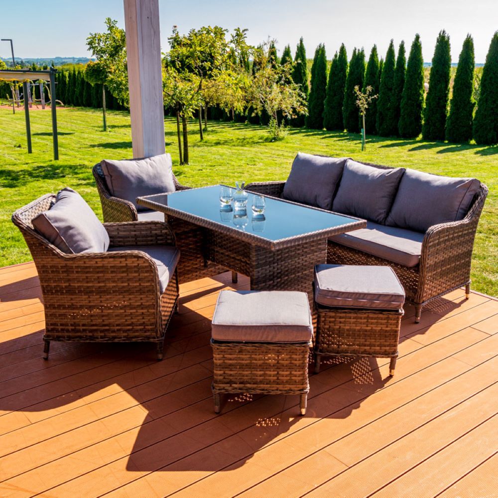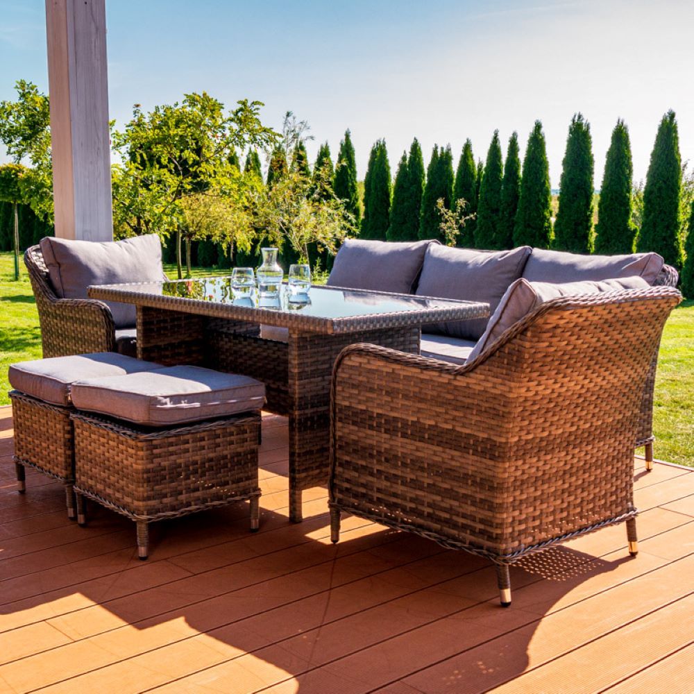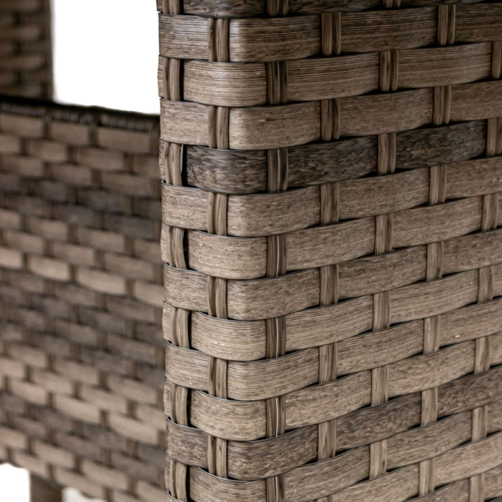 Rattanowe meble ogrodowe zawierają w zestawie sofę, stół, dwa fotele oraz dwie pufy. Zestaw mebli ogrodowych wykonany jest z plecionki technorattanowej, która cechuje się wysoką odpornością na uszkodzenia. Dzięki zastosowaniu rattanu komplet mebli ogrodowych sprawdzi się przez wiele sezonów. Konstrukcję mebli wykonano ze stali, która zapewnia stabilność oraz dodatkowo wpływa na wytrzymałość.