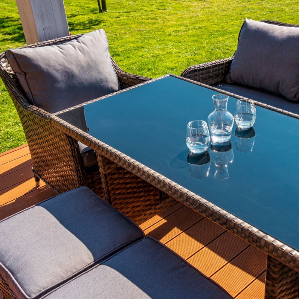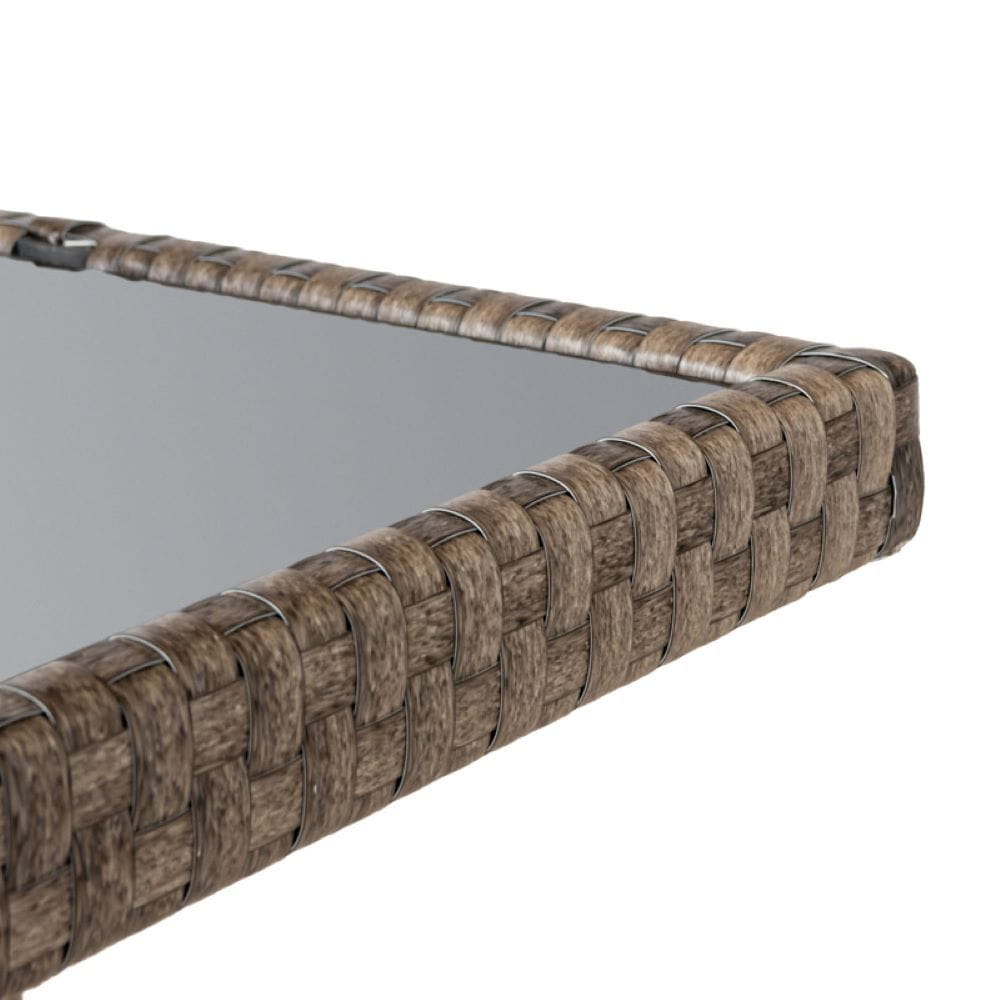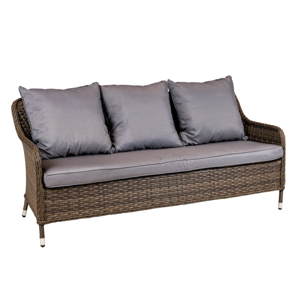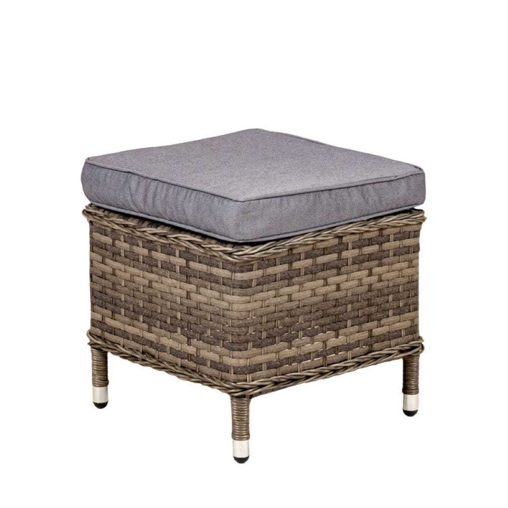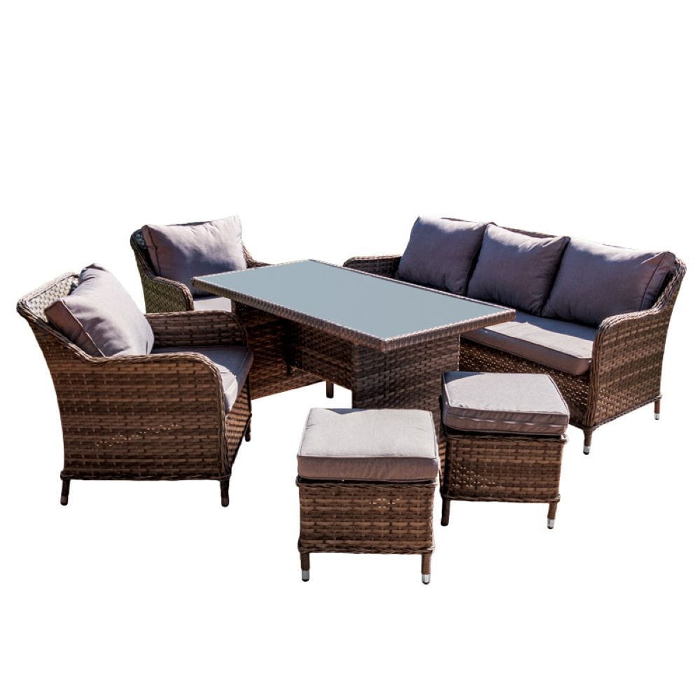 Rattanowe meble ogrodowe zawierają w zestawie sofę, stół, dwa fotele oraz dwie pufy. Zestaw mebli ogrodowych wykonany jest z plecionki technorattanowej, która cechuje się wysoką odpornością na uszkodzenia. Dzięki zastosowaniu rattanu komplet mebli ogrodowych sprawdzi się przez wiele sezonów. Konstrukcję mebli wykonano ze stali, która zapewnia stabilność oraz dodatkowo wpływa na wytrzymałość.